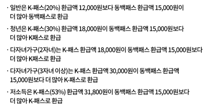 대중교통 이용금액이 4만 5천원 이하라도 15회 이상 이용한다면 동백패스와 K- 패스 혜택 중 더 큰 금액으로 자동환급!